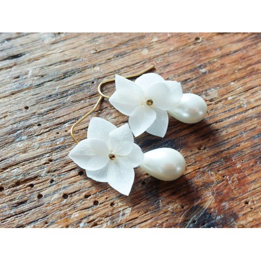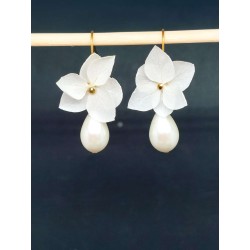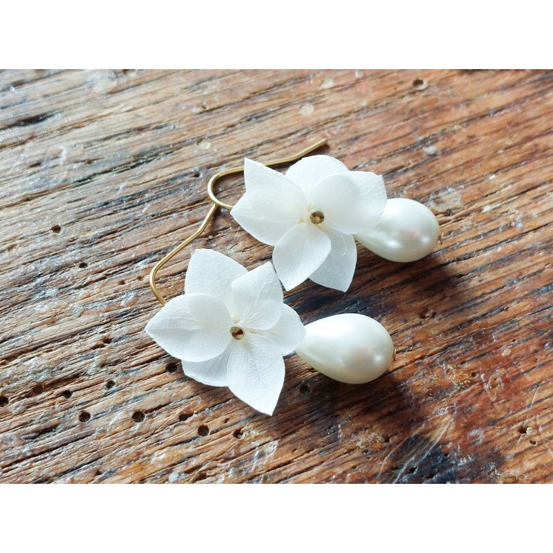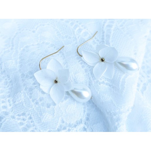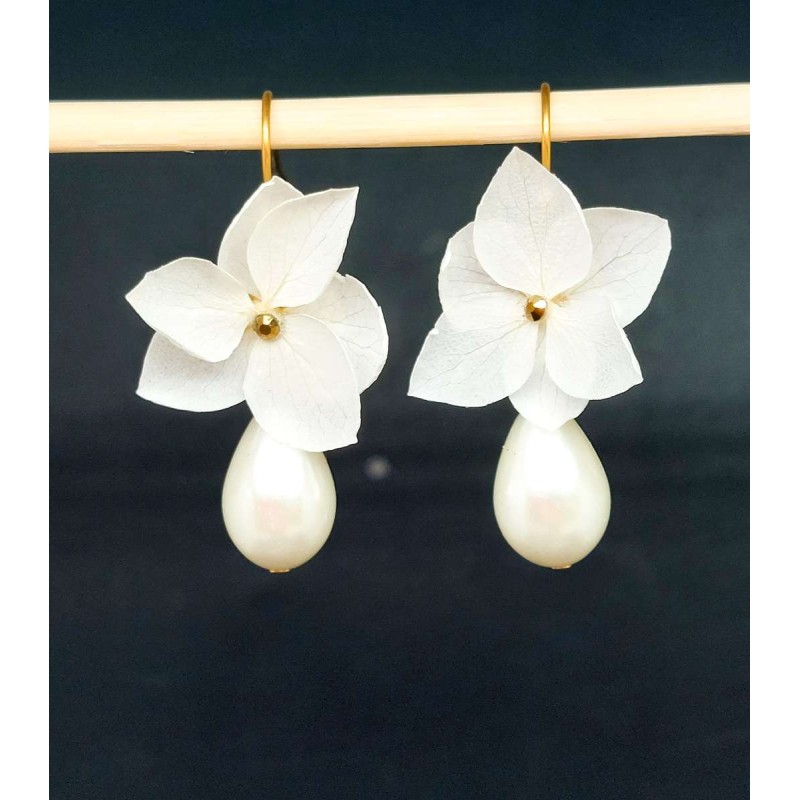 Boucles d'oreilles composées de crochets et chaines en acier inoxydable pétales d'hortensia, strass et gouttes de verre ivoire ou blanches