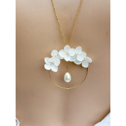 Fine chaîne en acier inoxydable doré ornée sur l'avant de 3 perles en verre nacré de 6mm, et sur l'arrière d'un cercle en acier inoxydable doré, de pétales d'hortensia naturels stabilisés et d'une goutte en verre nacré de 10x15mm