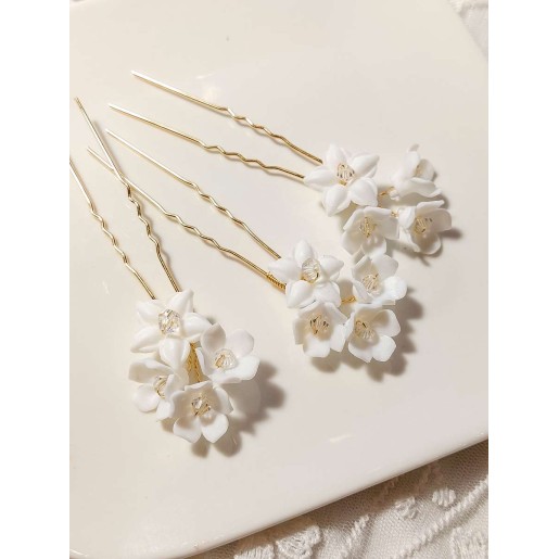 Composé de petites fleurs réalisées en pâte polymère qui donne un effet porcelaine sans le côté fragile de cette dernière et de petites perles en cristal, le tout montés sur des épingles de 65mm de hauteur