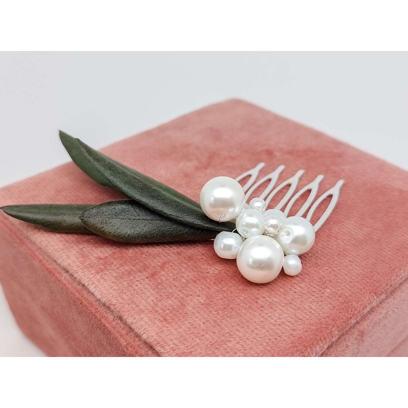 Composé de feuilles d'olivier naturelles, stabilisées et de perles en verre nacré 4, 6, 8 et 10mm montés sur un petit peigne de 25x40mm