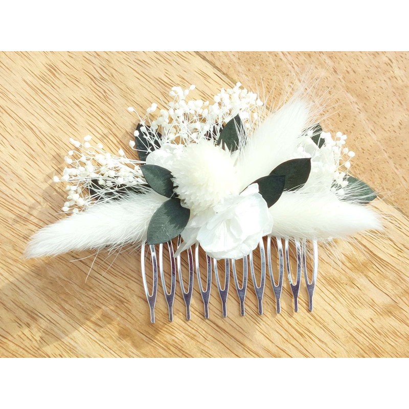 Joli peigne en métal argenté orné de feuilles d'eucalyptus, de gypsophile, lagurus sèchés et de pétales d'hortensia naturels, stabilisés.